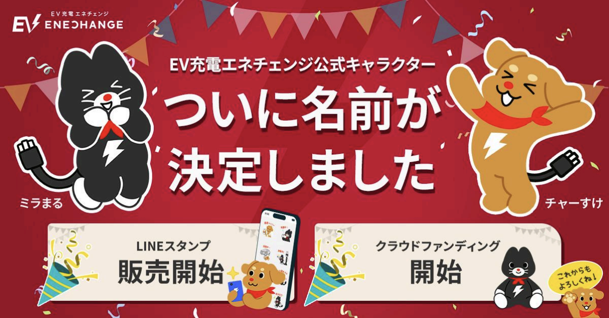 EV充電エネチェンジ、全国2,127件の応募を経てキャラクター名が決定!|〜LINEスタンプ販売・クラウドファンディング開始!ファンと創るEVブランドに〜
