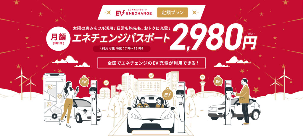 全国のEV充電エネチェンジ対応充電器が月額2,980円で使い放題。7時〜16時の太陽光発電が活発な時間帯に回数制限なく充電でき、近所のお買い物から旅行先まで、賢くおトクにEV充電できる定額プランです。