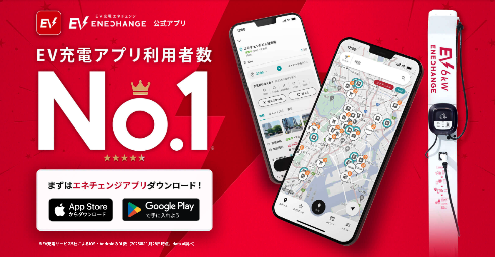 「EV充電エネチェンジ」は、導入台数や利用者数で国内No.1を誇るEV充電サービスです。アプリで全国の充電スポットを検索・予約でき、QRコードを読み取るだけで簡単に充電と決済が完了。月額費用0円で使えます。