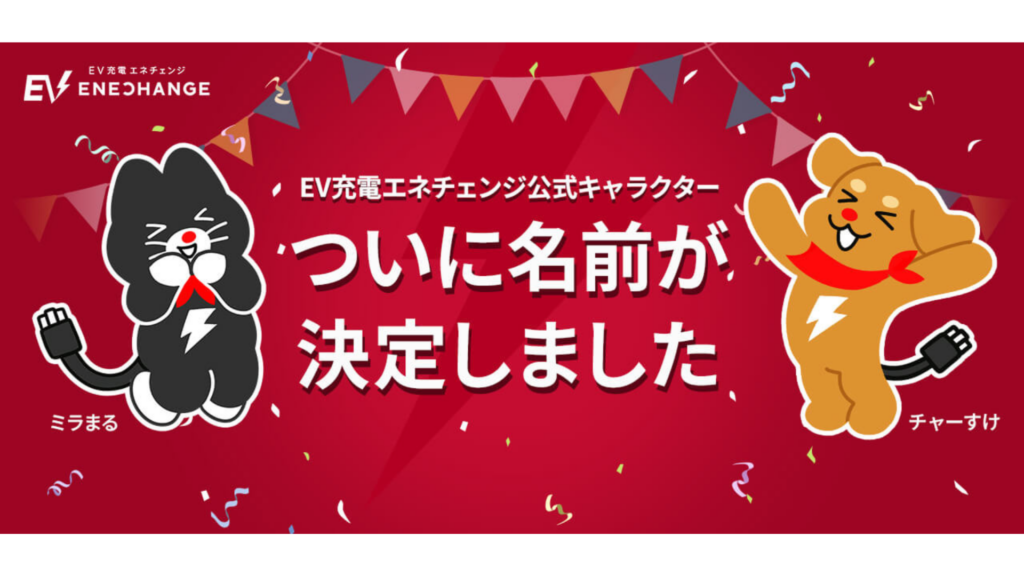 EV充電エネチェンジの公式キャラクター「チャーすけ」と「ミラまる」。走ると発電できる元気ないぬの男の子と、旅とグルメが大好きなのんびり屋のねこの女の子。お揃いの赤いスカーフが目印です。